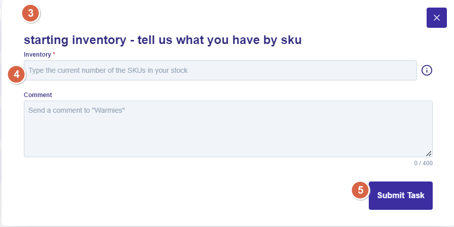 In the Task Popup (3), provide the requested information to complete the task (4), including any files or attachments needed, and click the Submit Task button (5).