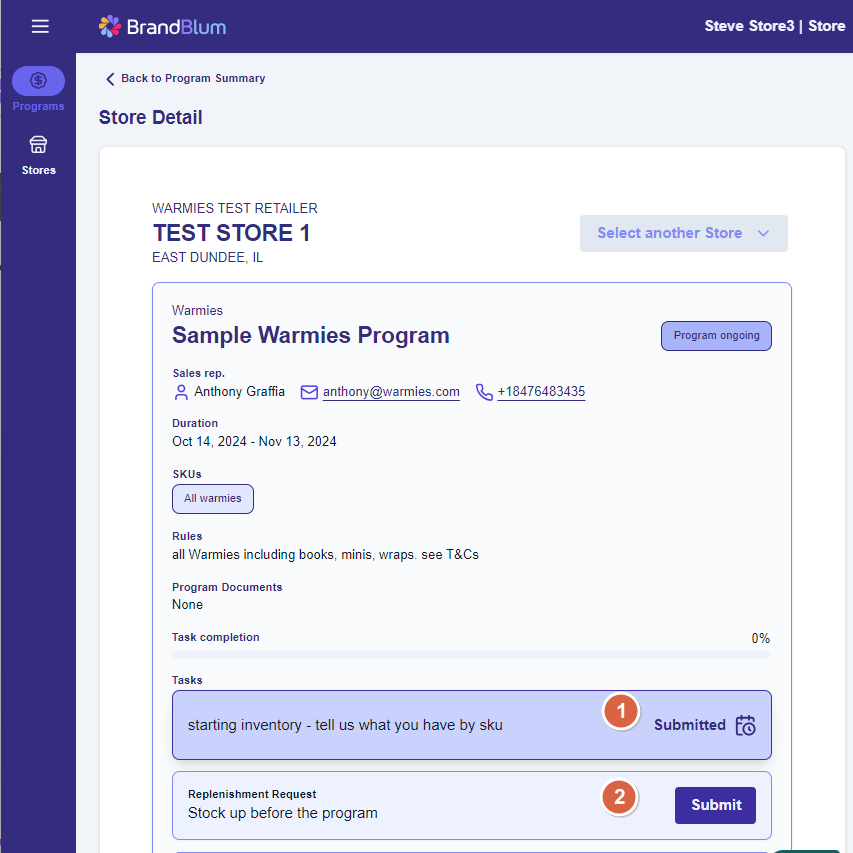Once you're on the Store Detail page, you can work on the Tasks. Scroll down to the Tasks section (1).