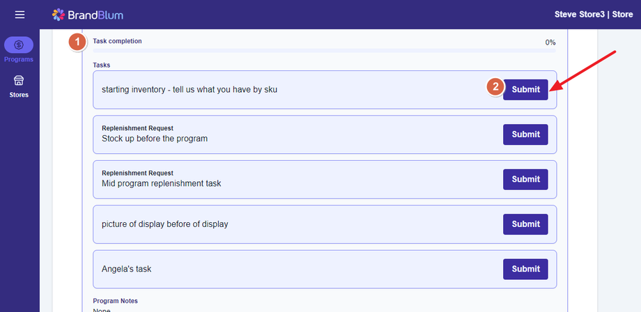 You'll be taken back to the Store Detail page. Your task will show Submitted (1) and you can work on your next task (2) - just repeat everything in Step 4 above.