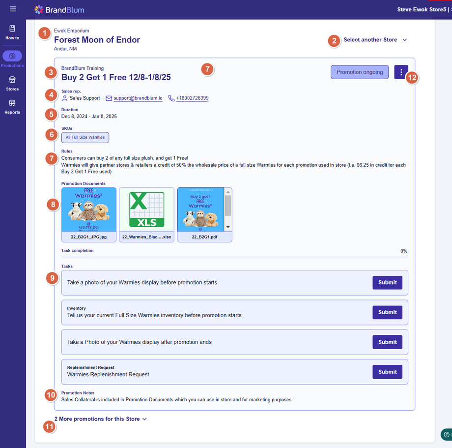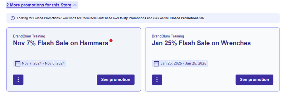 Your store may be participating in several promotions and they'll all be shown here. This section makes it easy to move from Promotion to Promotion for your Store. Just click the See Promotion button to go to that promotion.