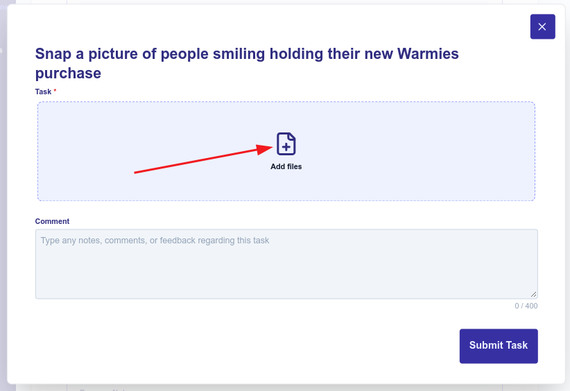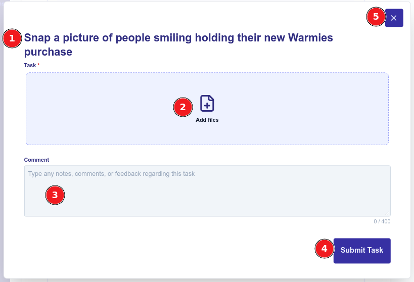 5. X (Close) button: To close this popup without entering information or submitting the task, click the X button.