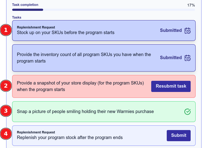 - Green Box, checkmark icon: Task approved & completed! No further action is required. You can click on the task to see your submission and the Sales Team's approval.