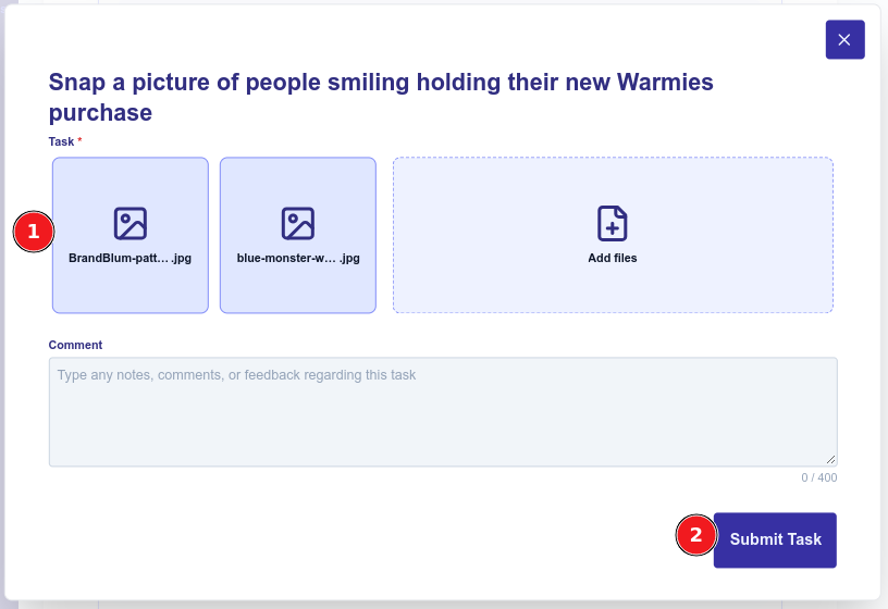The screenshot below shows some files added (1) and the Submit Task button (2).