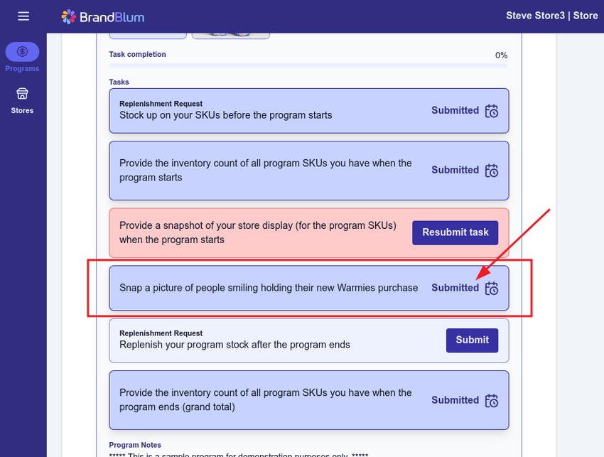 Once you've submitted the task, you'll be back to the Store Detail page where you'll notice that the task has a calendar icon (the arrow) and says "Submmitted". The Submit button will also disappear.