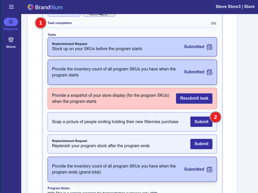 This will take you to the Store Detail page, where you can work on your Tasks. Scroll down to the Tasks section (1, in the screenshot below).